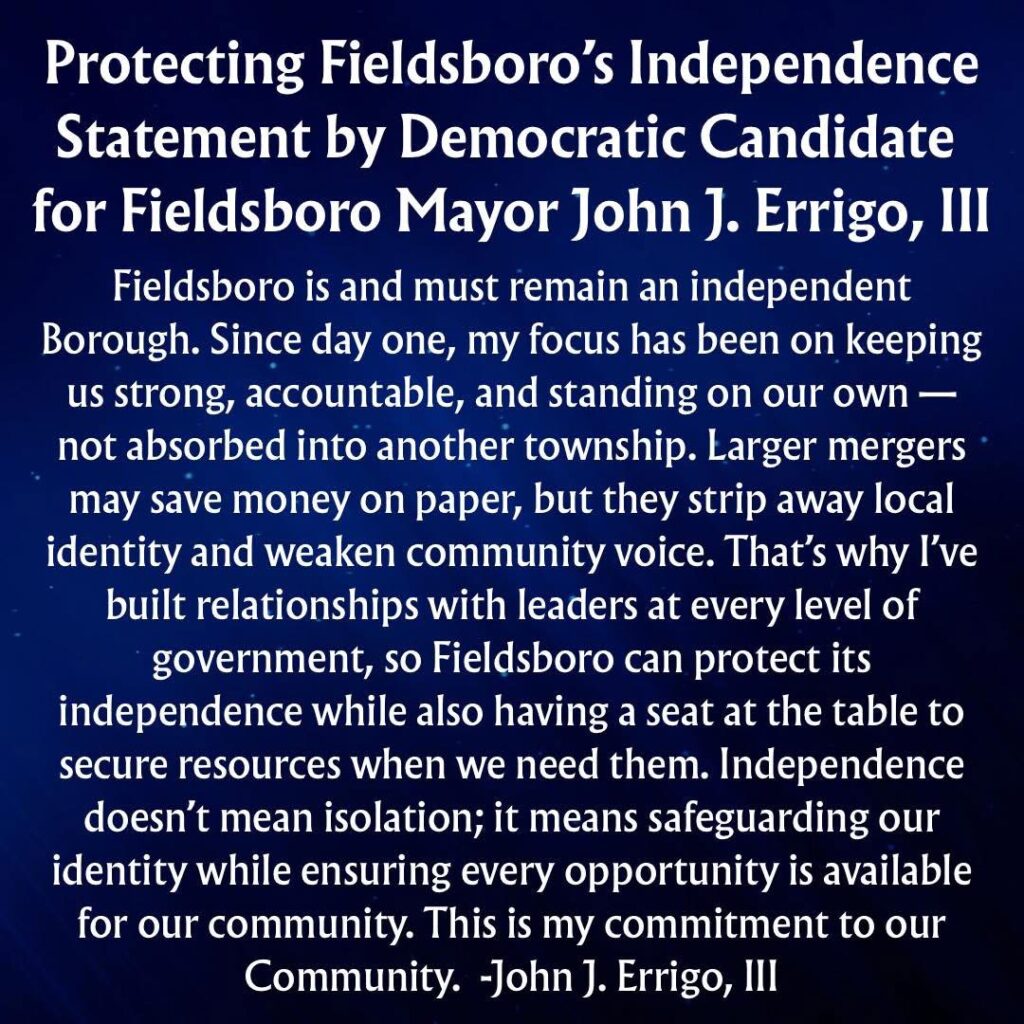 On November 4, we’re voting to keep Fieldsboro an independent, strong Borough. I do not advocate for and will never support merging with another town. For too long, the past 44 years we were isolated without a real voice at the table. I’ve worked to change that by building relationships with leaders at every level of government so Fieldsboro is heard and supported.
