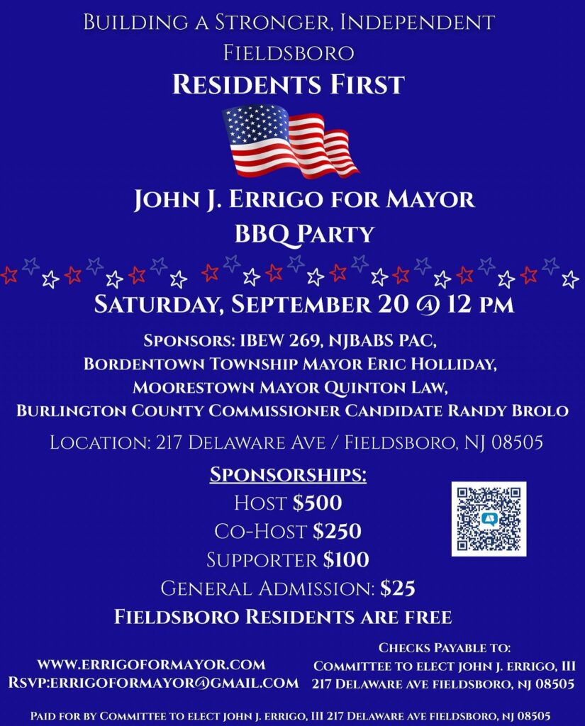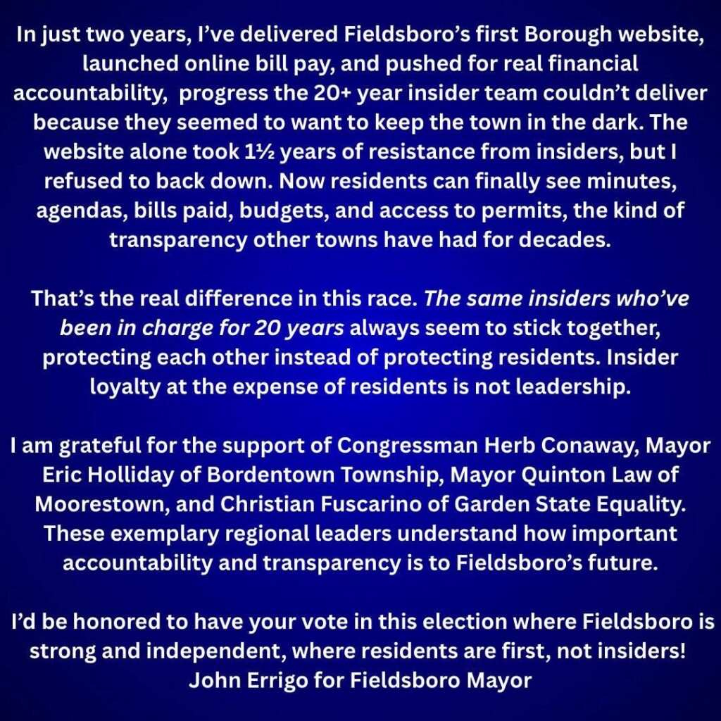 I’m John J. Errigo III, Council President of Fieldsboro, NJ, and I’m deeply grateful for the trust you showed in our June 10 primary win against a 14-year incumbent.