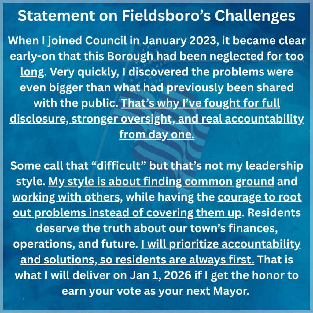 #FieldsboroForward #LeadershipThatShowsUp #ResidentsFirst #AccountabilityMatters #TransparencyWins